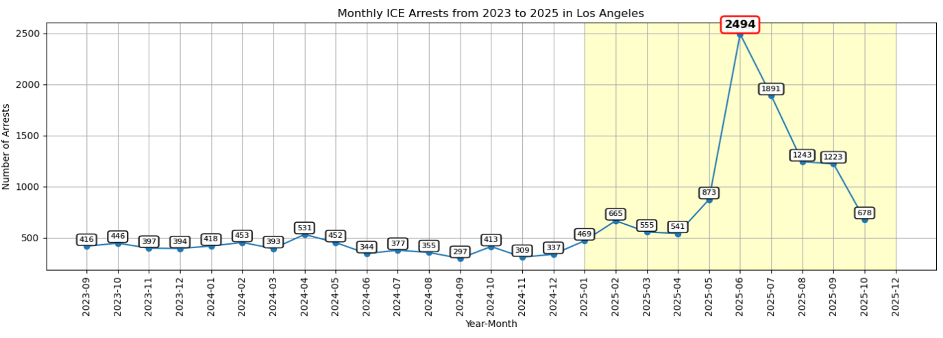 Figure 2: Monthly ICE arrests in Los Angeles show moderate fluctuations from September 2023 through 2024, followed by a dramatic escalation in early 2025 that peaks at 2,494 arrests in June. This mid-2025 surge represents the most significant enforcement increase in the entire period.