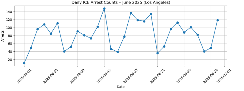 Figure 3: Daily ICE arrests in Los Angeles during June 2025 show consistently elevated activity with multiple peaks above 120 arrests, illustrating the intensity and frequency of enforcement throughout the month.