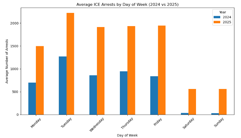 Figure 4: Average ICE arrests were substantially higher across every weekday in 2025 compared to 2024, with peak activity occurring Tuesday through Friday and minimal enforcement on weekends.